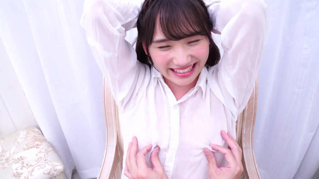 最後は、Yシャツ姿にノーブラで登場。簡単なインタビューをした後は、マッサージが始まります。まずは足の裏から。くすぐったい感じのリアクションからはじまり、片足を挙げて、白パンツをみせてくれます。そして太ももへ。さらにおまんこの周りをさわさわ。背ssぃやでしっかりみせてくれます。さらに耳の裏をさわさわ。そして腕を頭の後ろに組んで、おっぱいをさわさわ。さらに乳首もさわさわしてくれます。少し感じ始めたリアクションがいいですね。そして乳首をつまんで、くりくりとすごくいい攻めをしてくれます。さらに先っぽをさわさわと身体がビクンと反応して最高にいいですね。また感じている表情もいい!